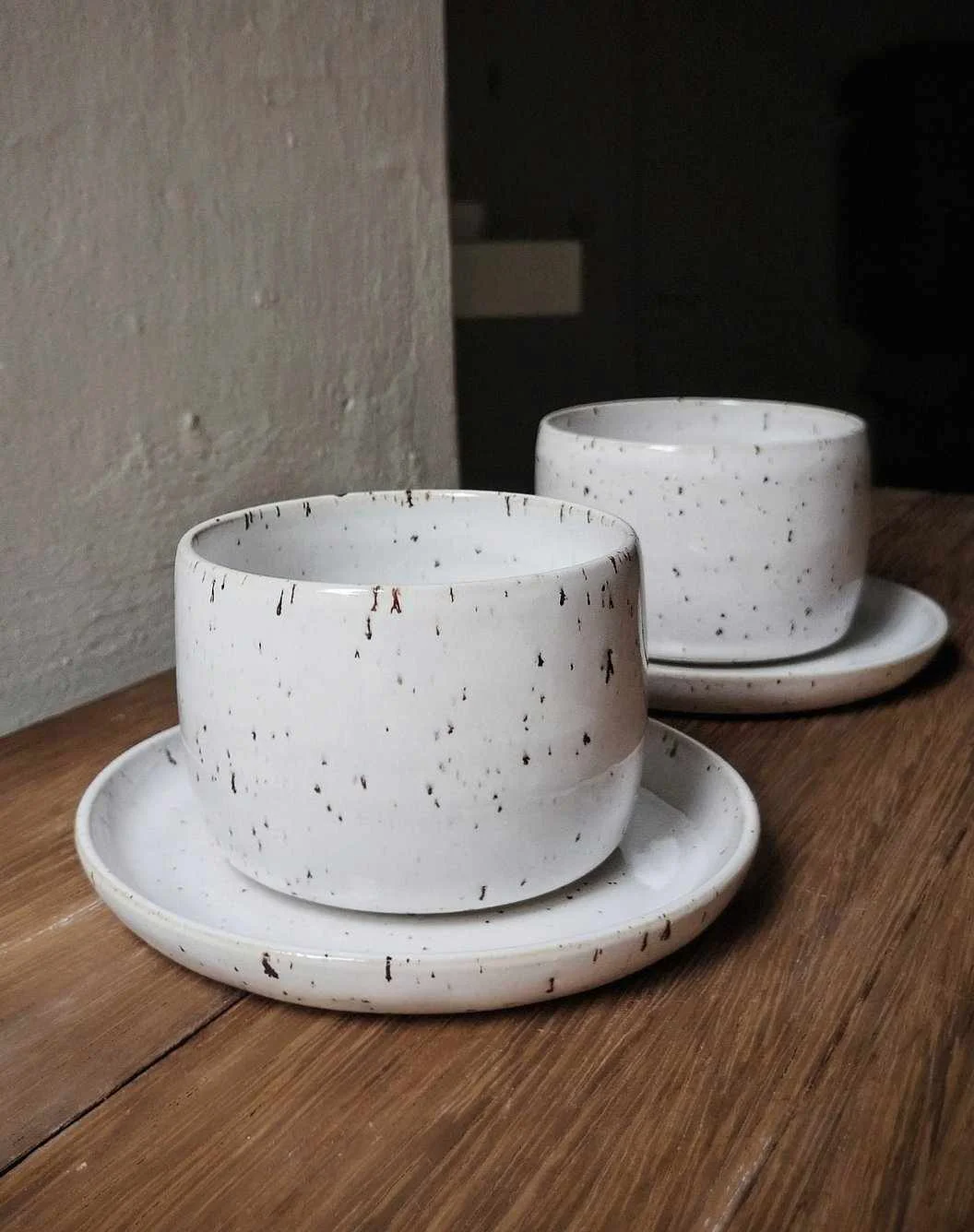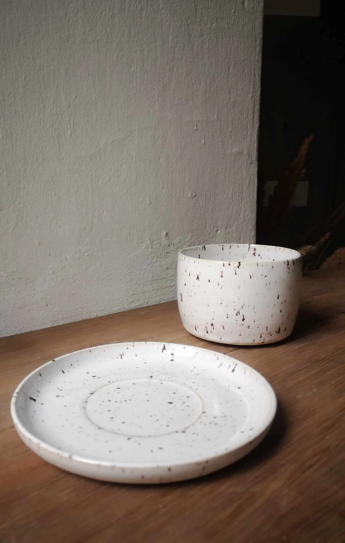 Czarka Light toczona na kole garncarskim z jasnej gliny, nakrapianej. Wewnątrz i na zewnątrz pokryta białym szkliwem.
