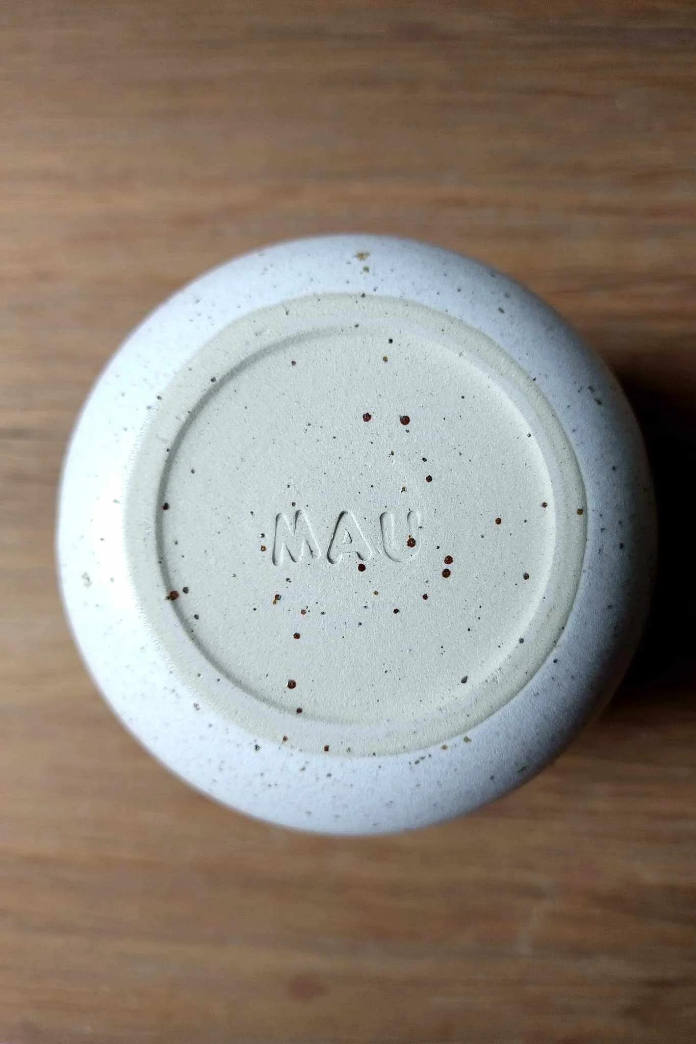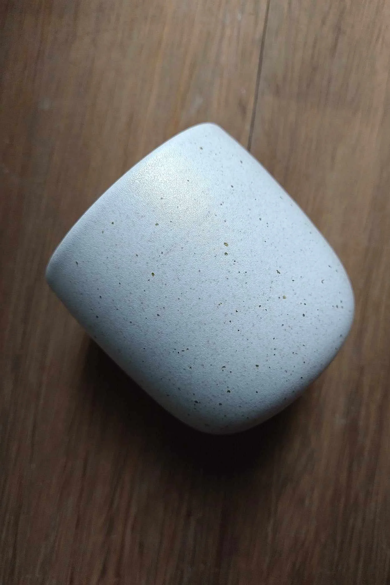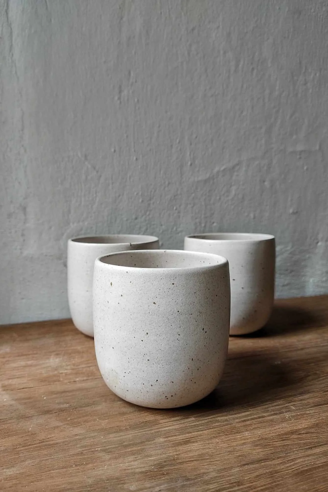 Kubek Light toczony na kole garncarskim z jasnej gliny, nakrapianej. Wewnątrz i na zewnątrz pokryty satynowym, różowo-beżowym szkliwem.
