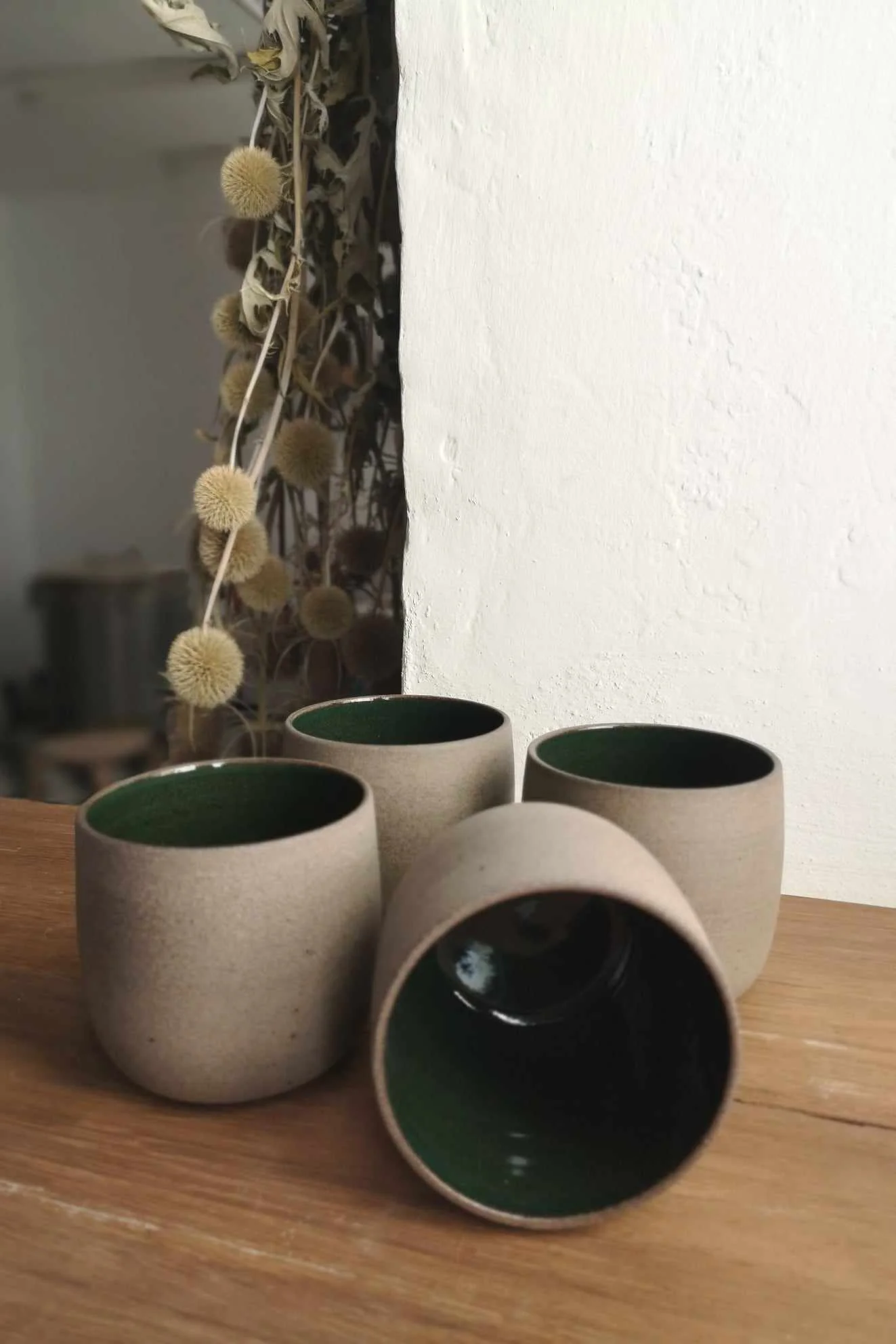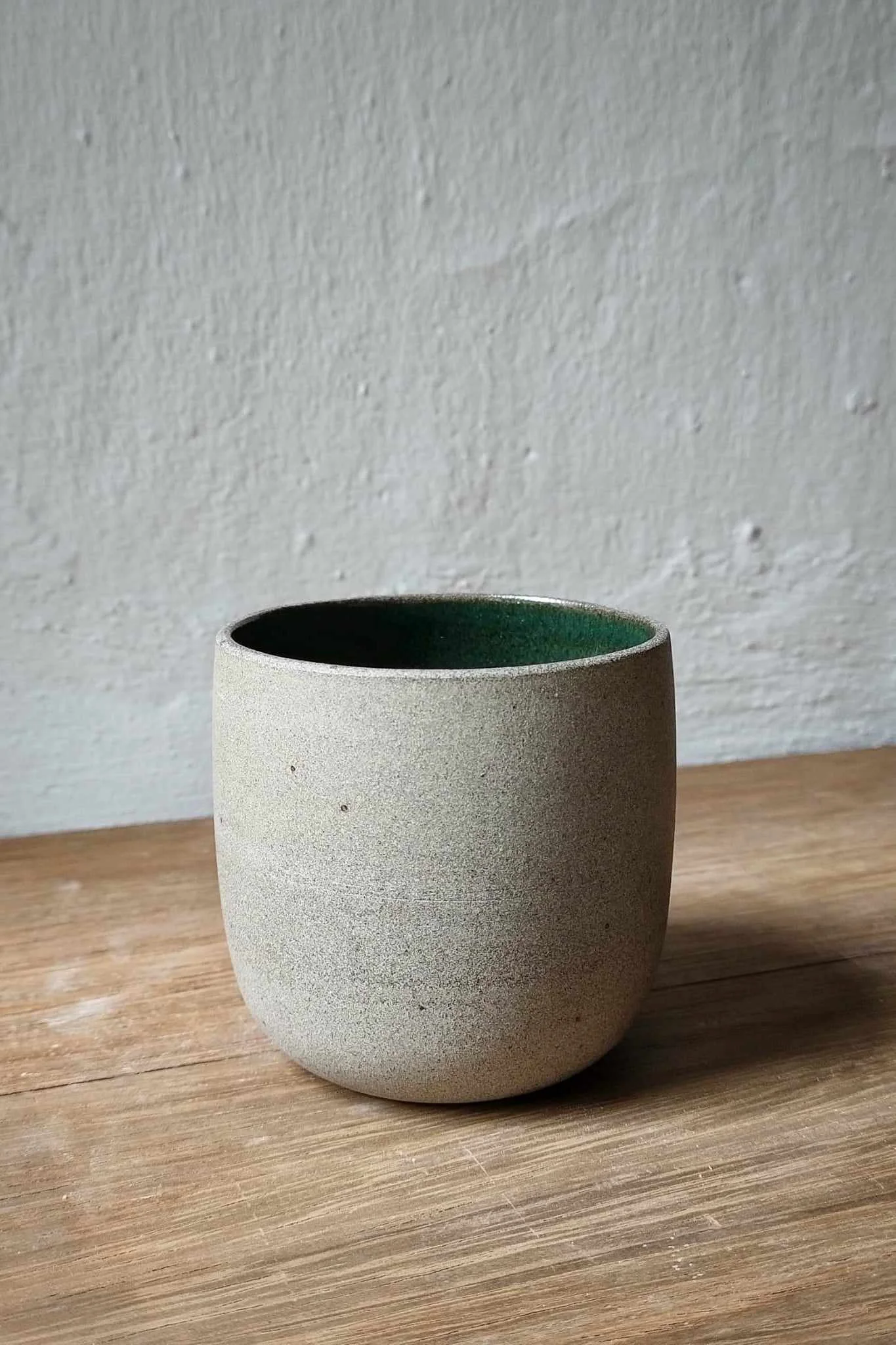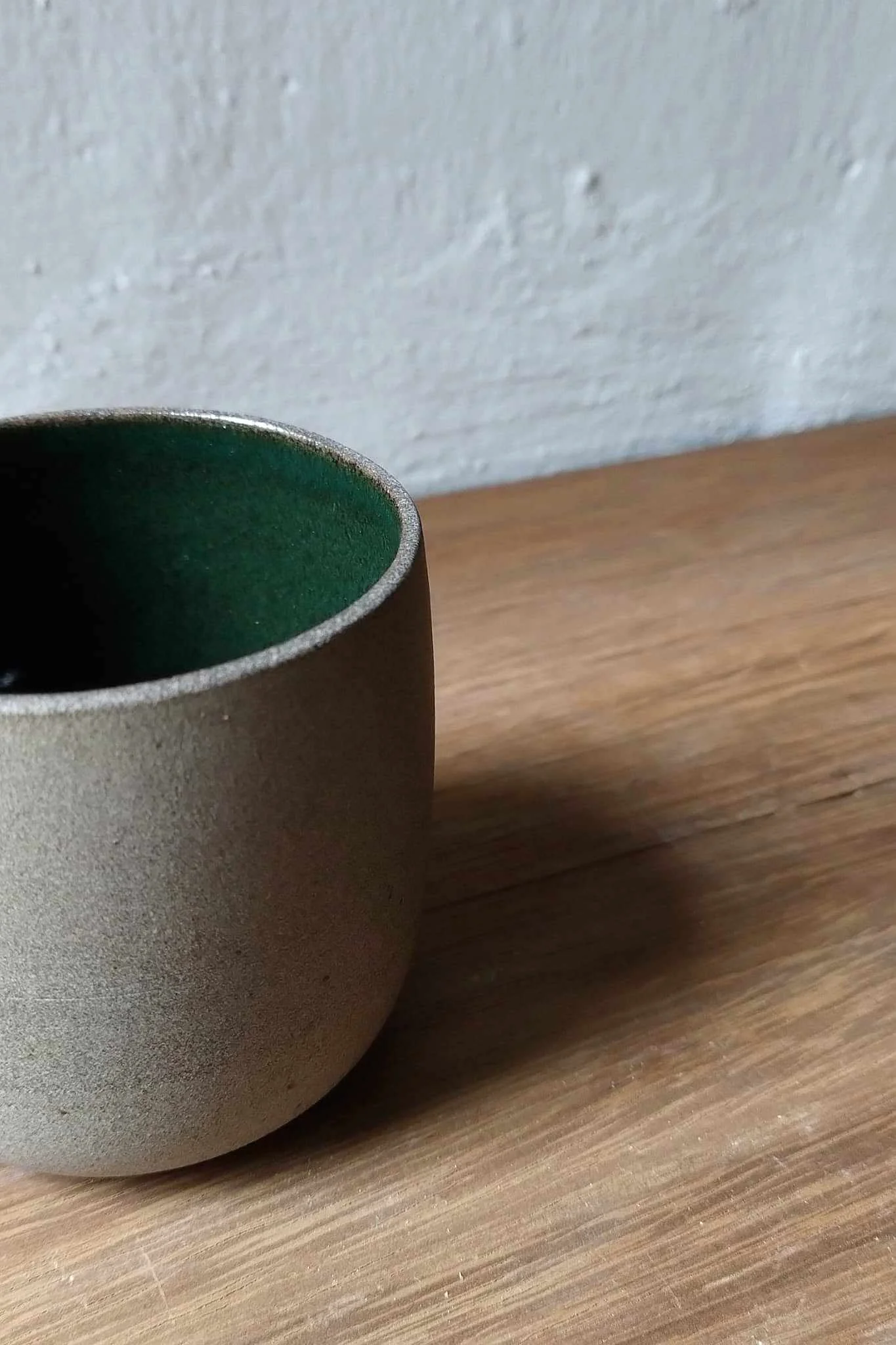 Czarka Natural toczona na kole garncarskim z brązowo-piaskowej gliny. Wewnątrz pokryta zielonym szkliwem, na zewnątrz surowa glina.