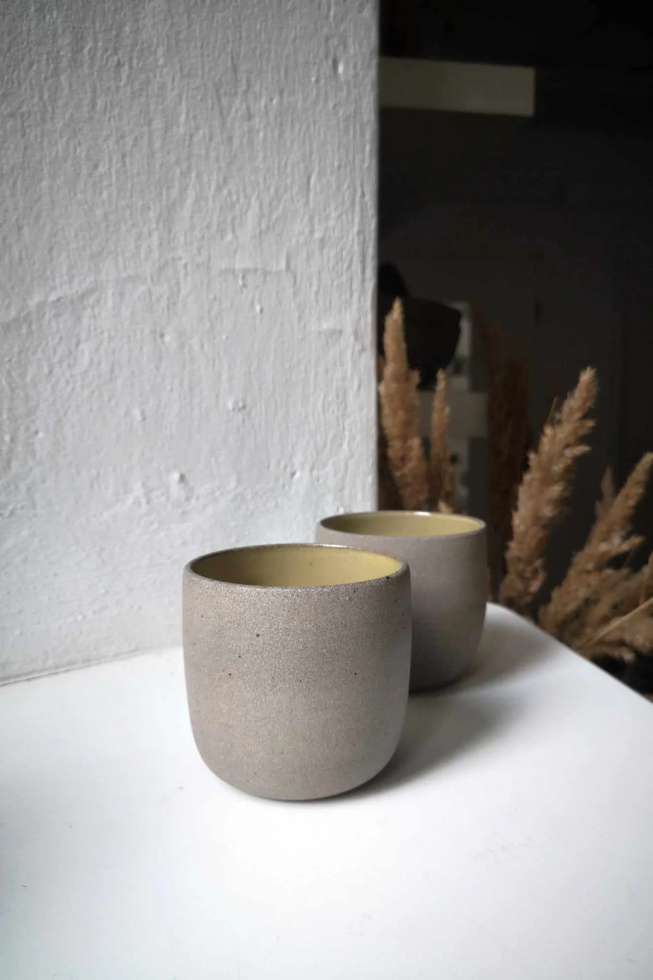 Czarka Natural toczona na kole garncarskim z brązowo-piaskowej gliny. Wewnątrz pokryta żółtym szkliwem, na zewnątrz surowa glina.
