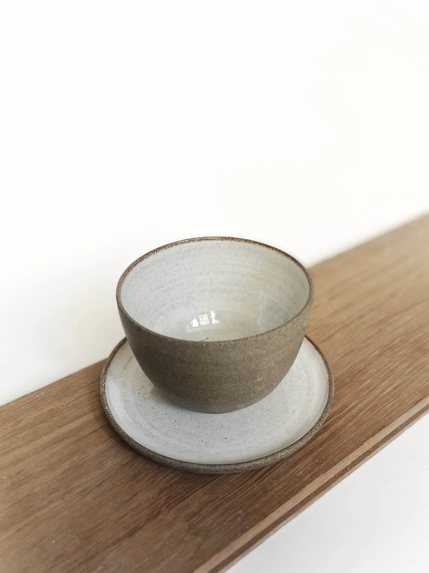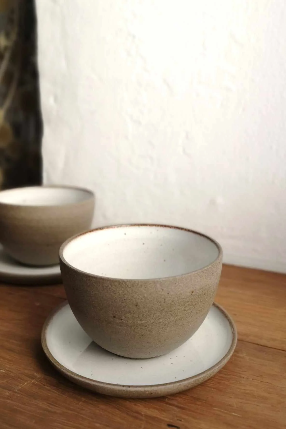 Filiżanka ze spodkiem Natural toczona na kole garncarskim z brązowo-piaskowej gliny. Wewnątrz pokryta białym szkliwem.