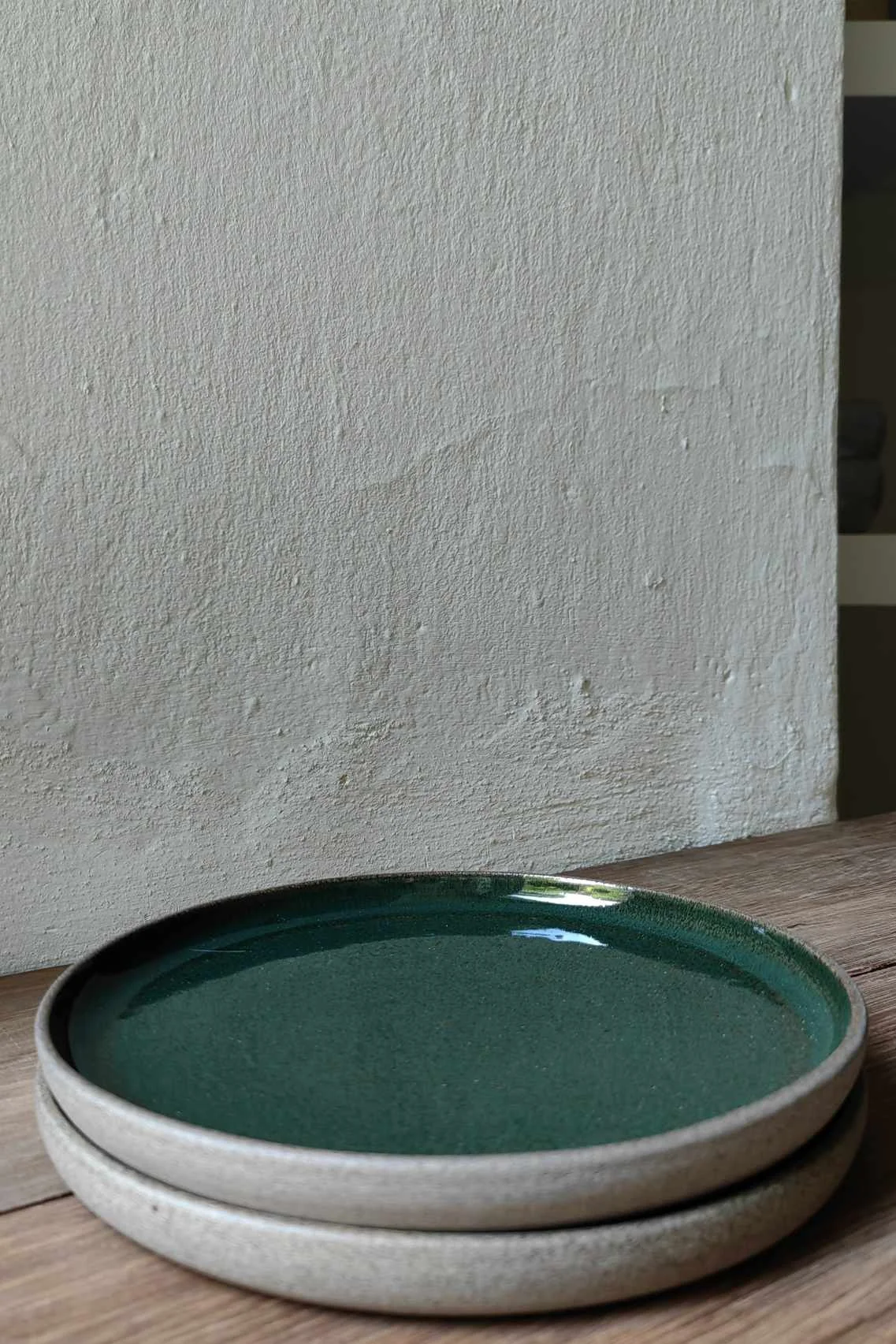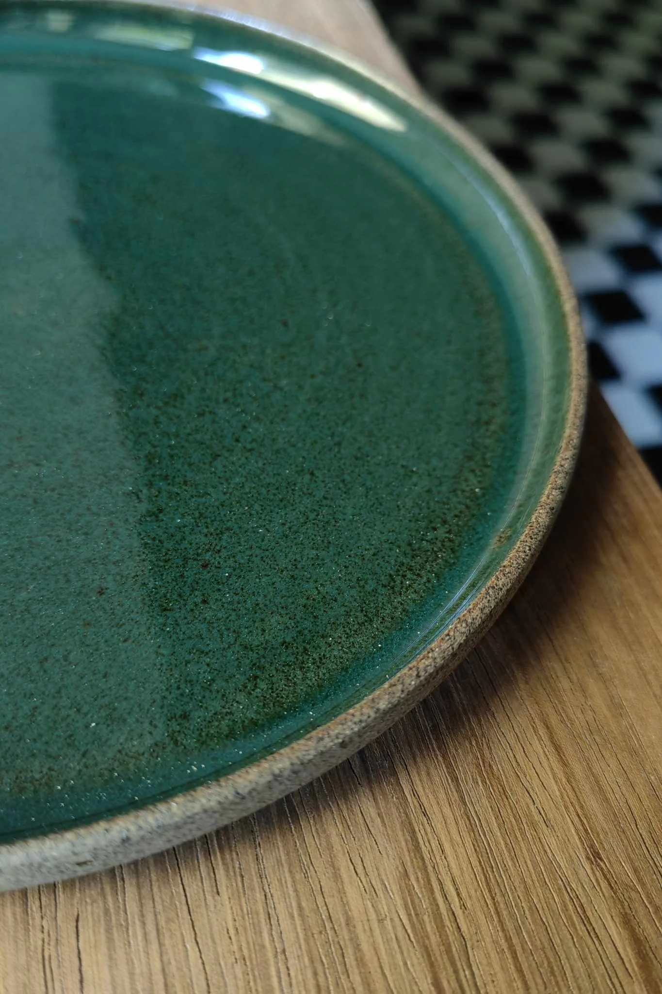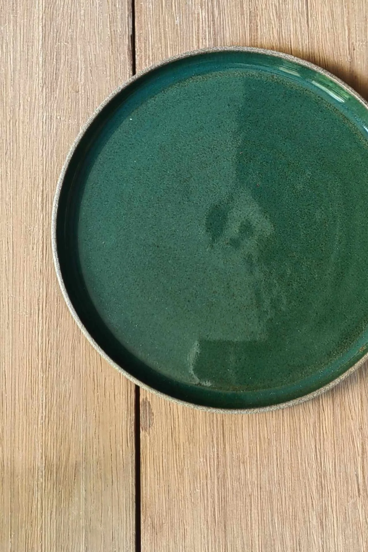 Talerz Natural z brązowo-piaskowej gliny. Wewnątrz pokryty zielonym szkliwem, na zewnątrz surowa glina.
