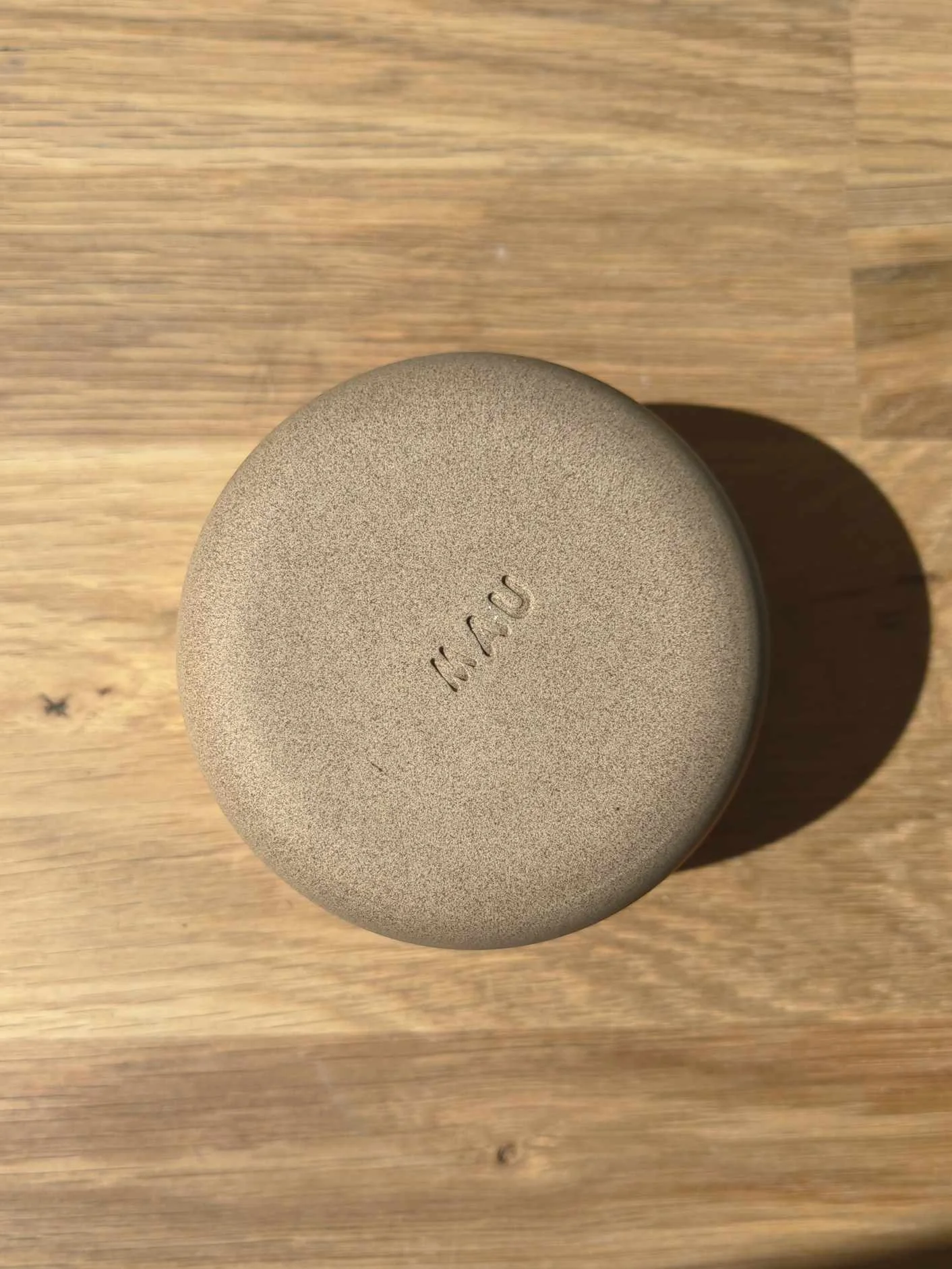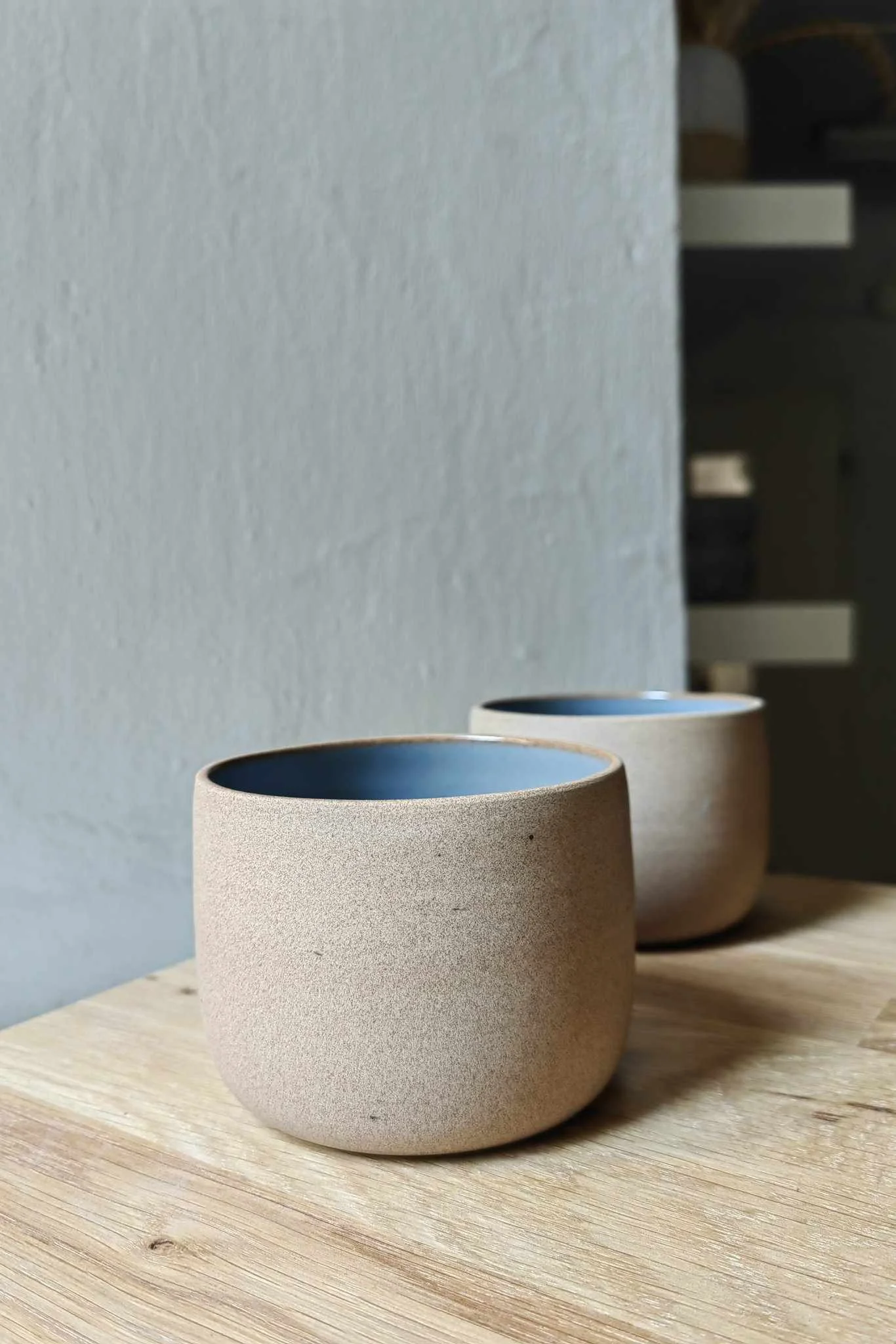 Czarka Sand toczona na kole garncarskim z piaskowej gliny. W środku pokryta niebiesko-szarym szkliwem, na zewnątrz surowa glina.