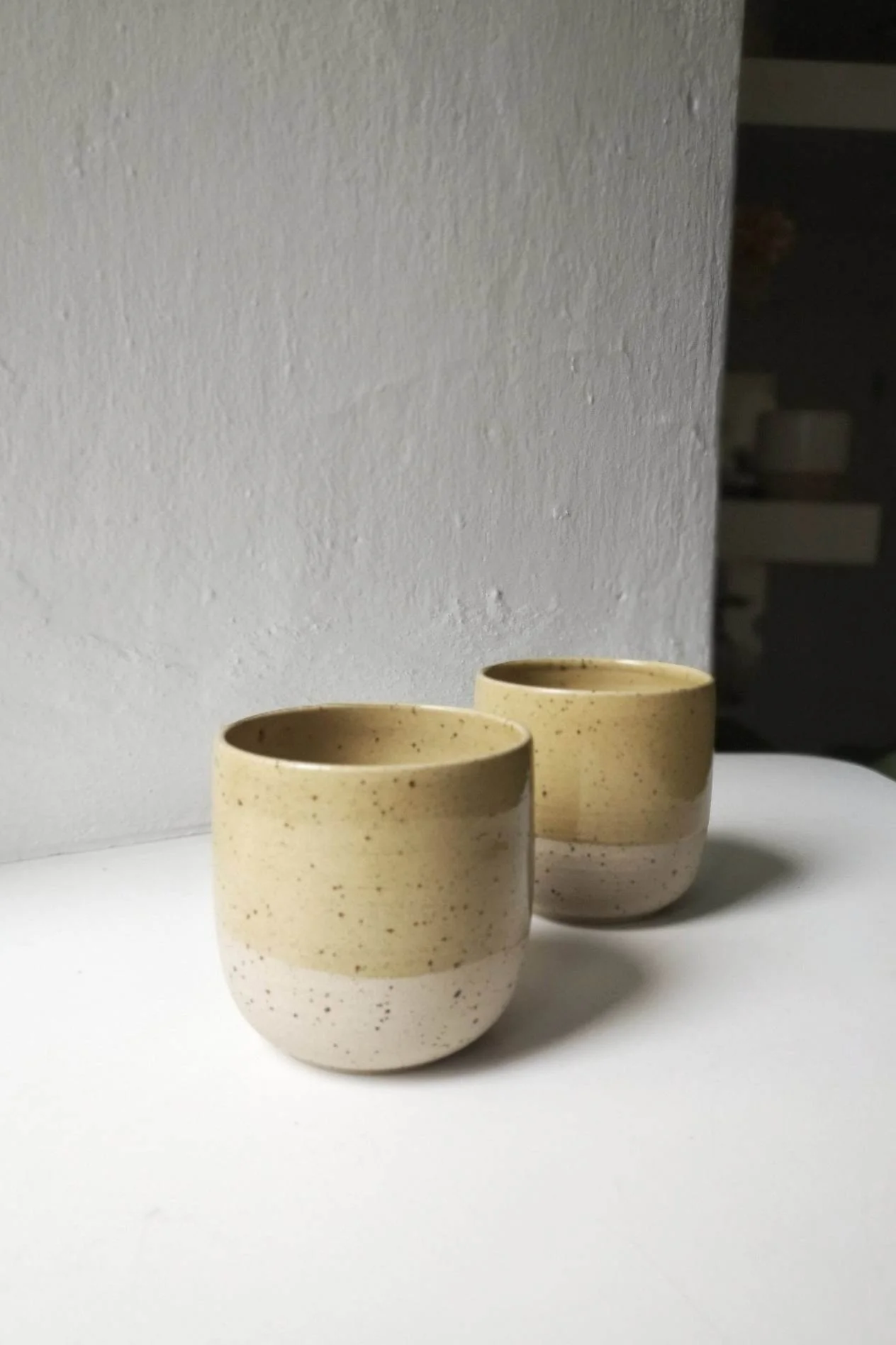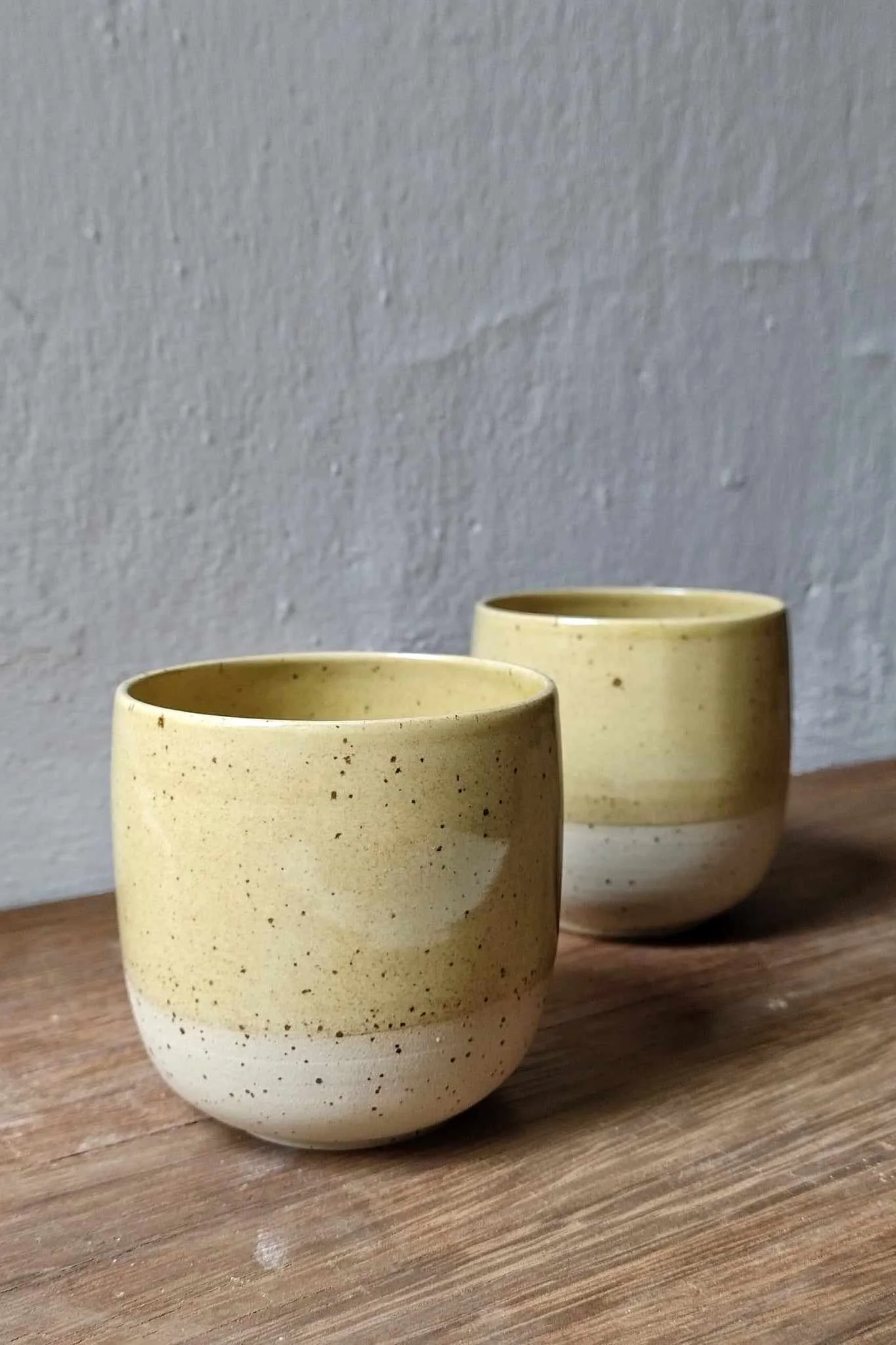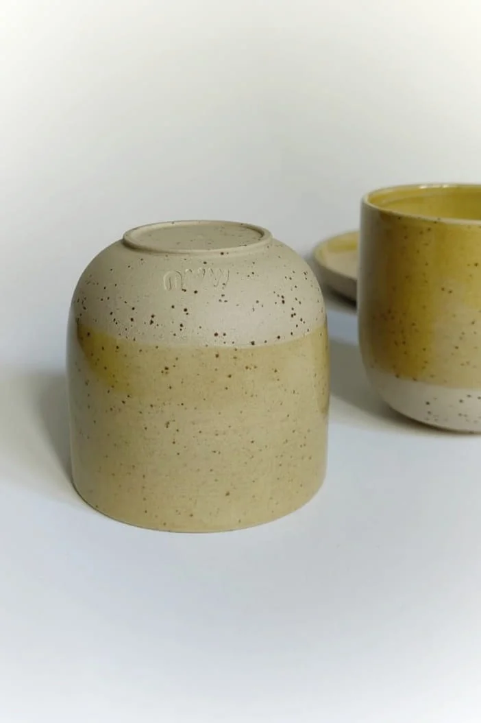 Czarka Light toczona na kole garncarskim z jasnej gliny, nakrapianej. Wewnątrz i częściowo na zewnątrz pokryta żółtym szkliwem.