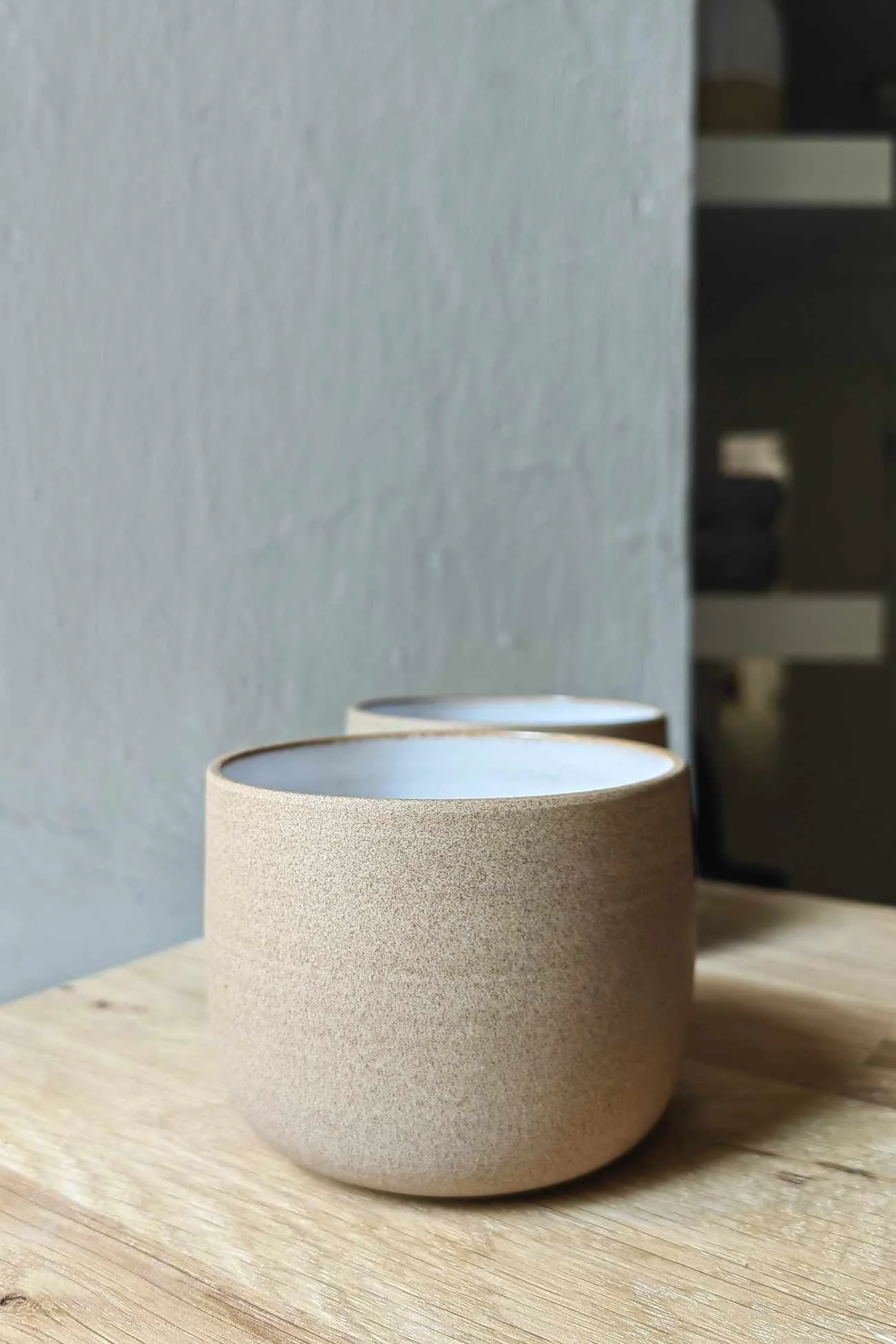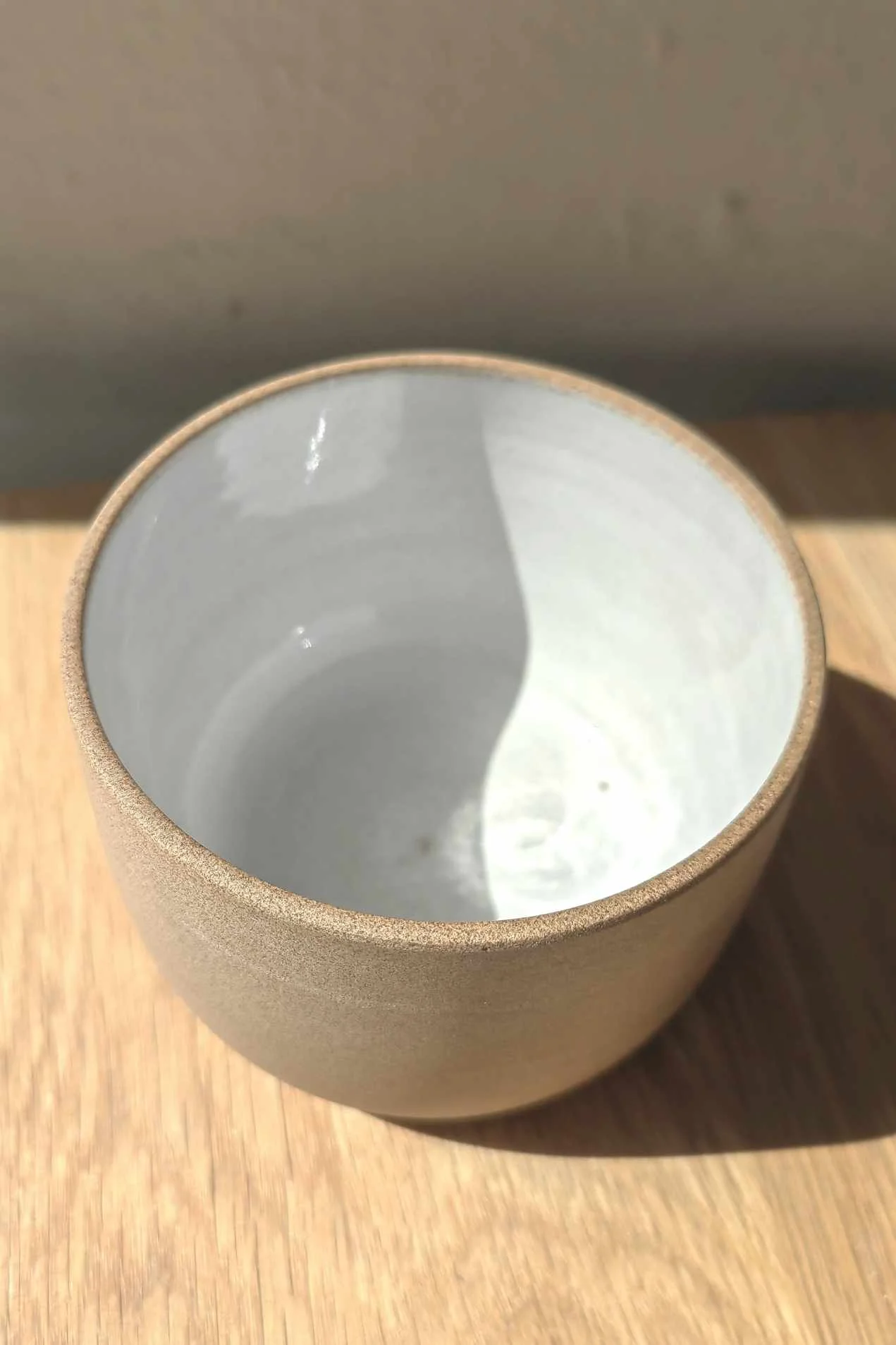 Czarka Sand toczona na kole garncarskim z piaskowej gliny. W środku pokryta białym szkliwem, na zewnątrz surowa glina.