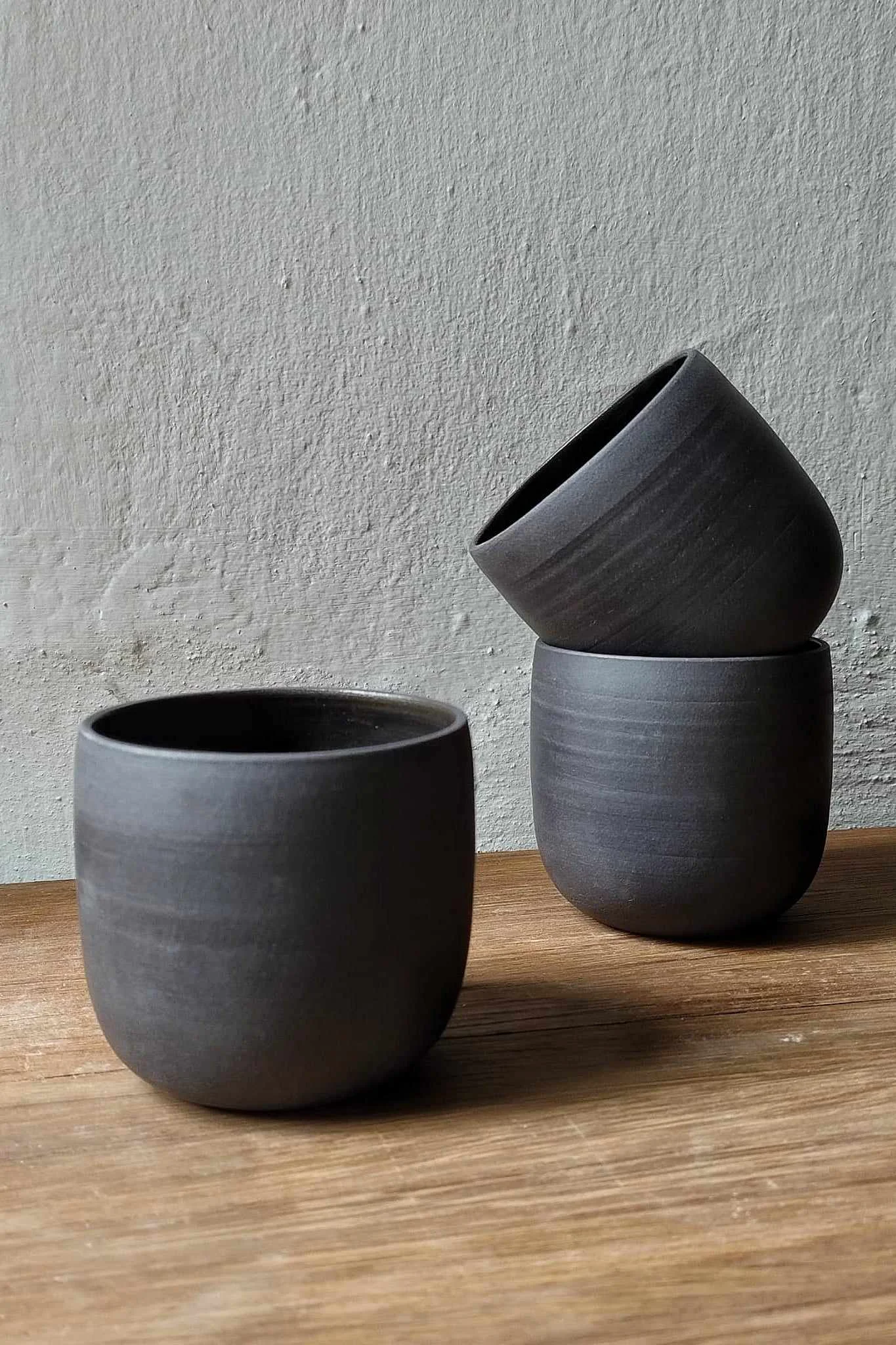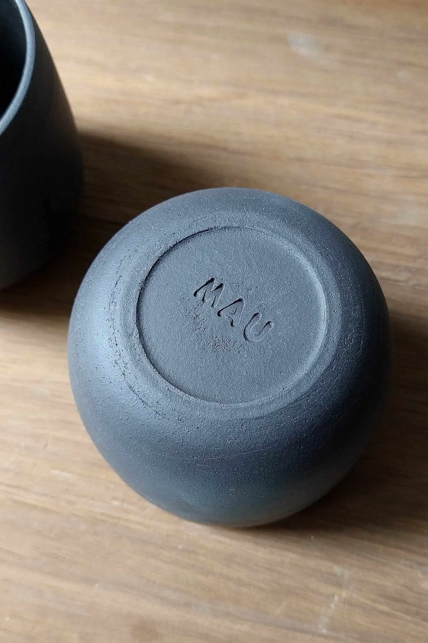 Czarka Dark toczona na kole garncarskim z ciemnej gliny. Wewnątrz pokryta czarnym, matowym szkliwem, na zewnątrz surowa glina.