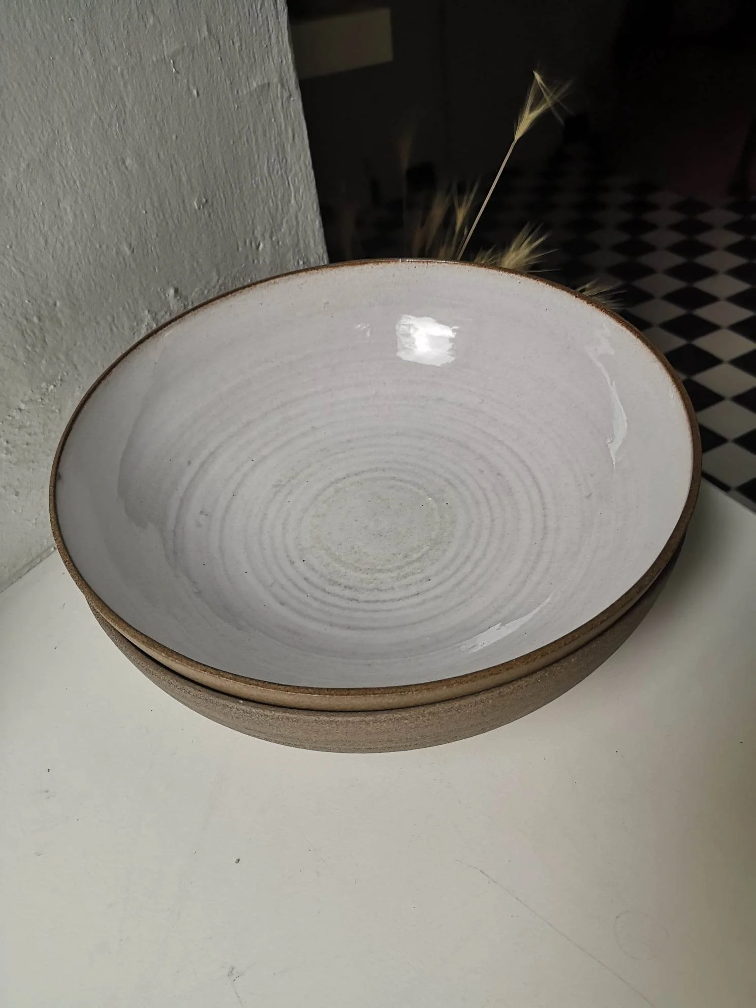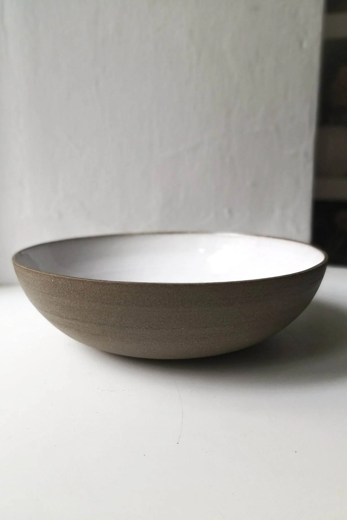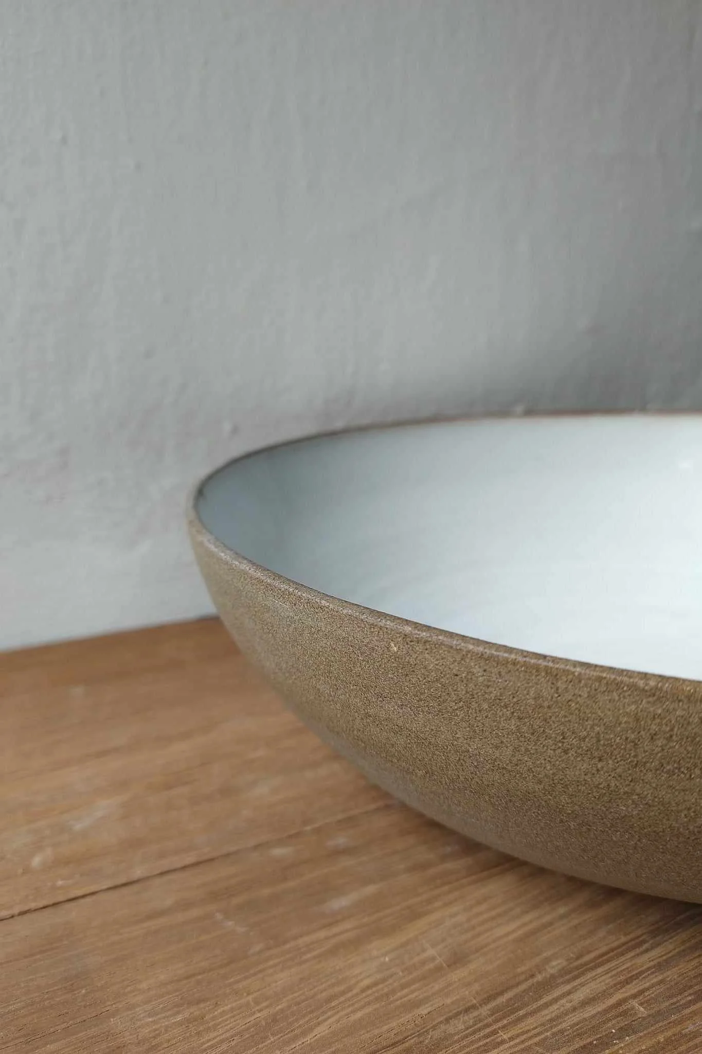 Misa Natural toczona na kole garncarskim z brązowo-piaskowej gliny. Wewnątrz pokryta białym szkliwem, na zewnątrz surowa glina.