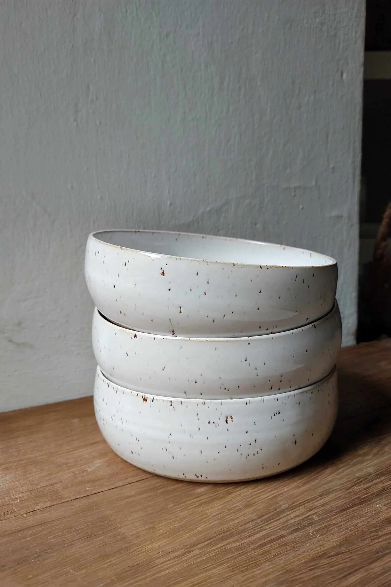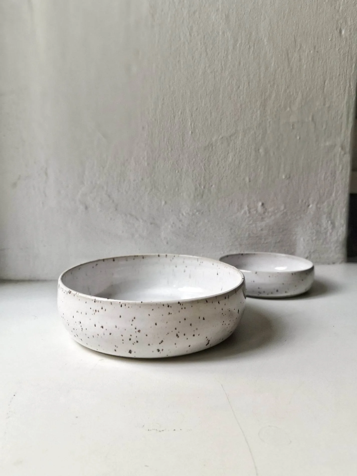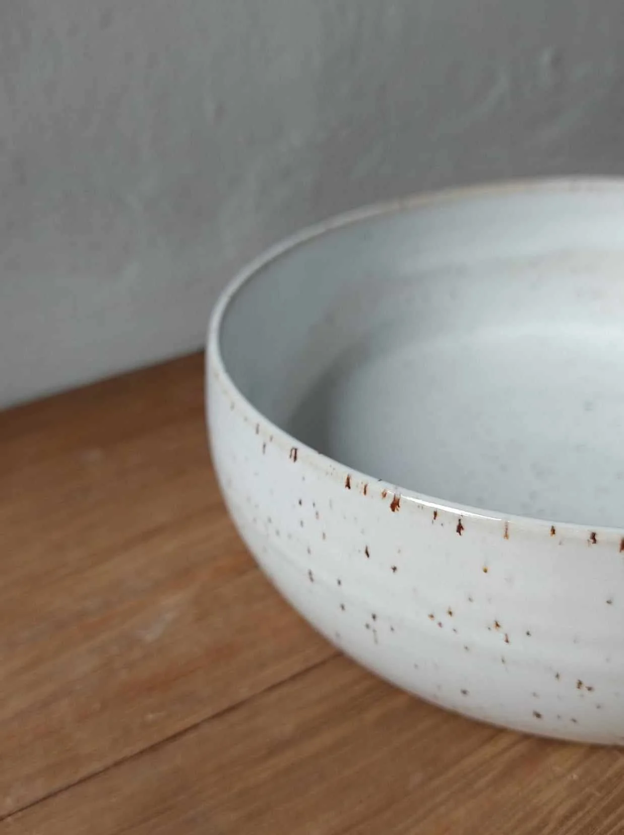 Miska Light toczona na kole garncarskim z gliny nakrapianej. Wewnątrz i na zewnątrz pokryta białym szkliwem.