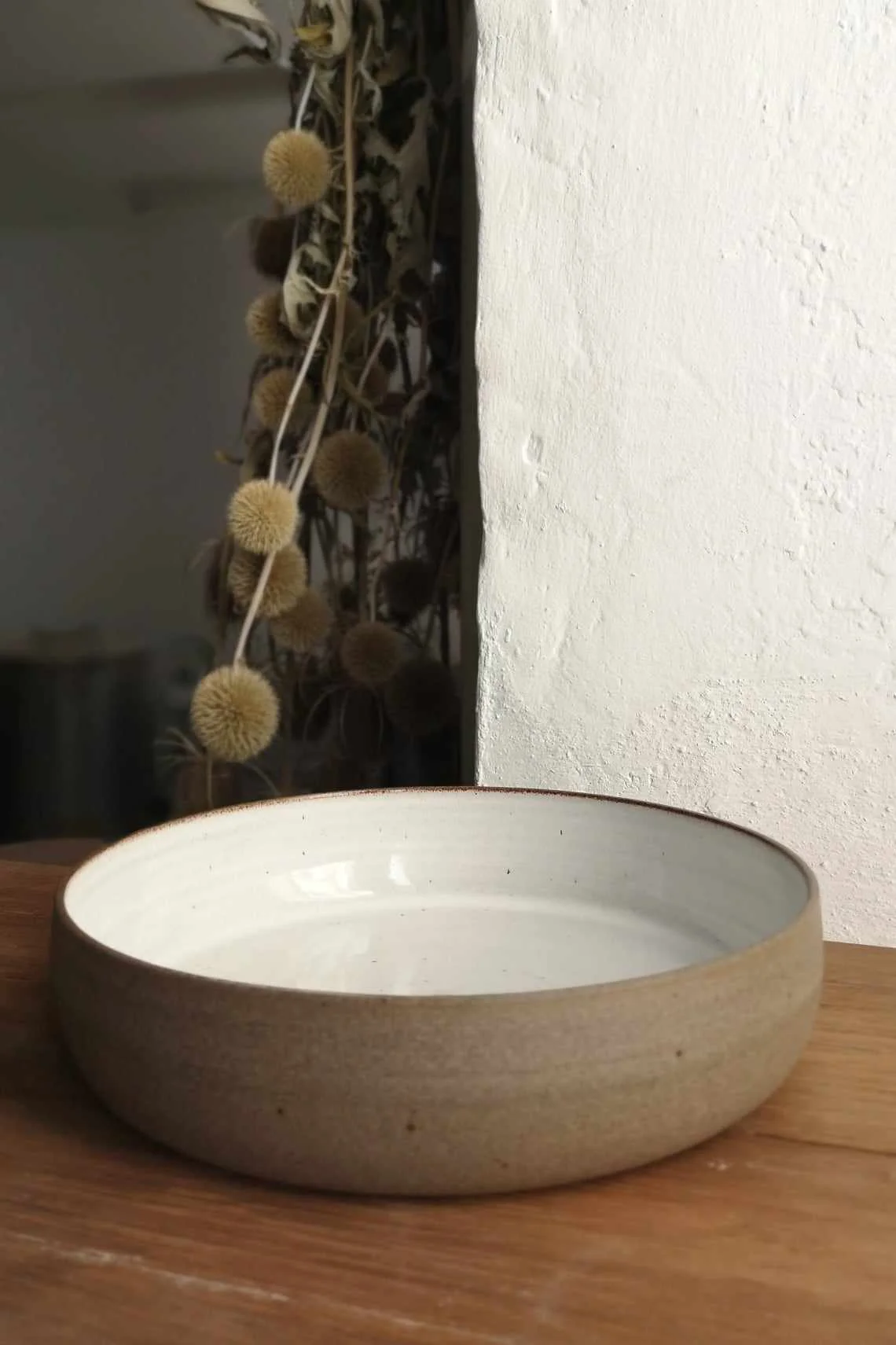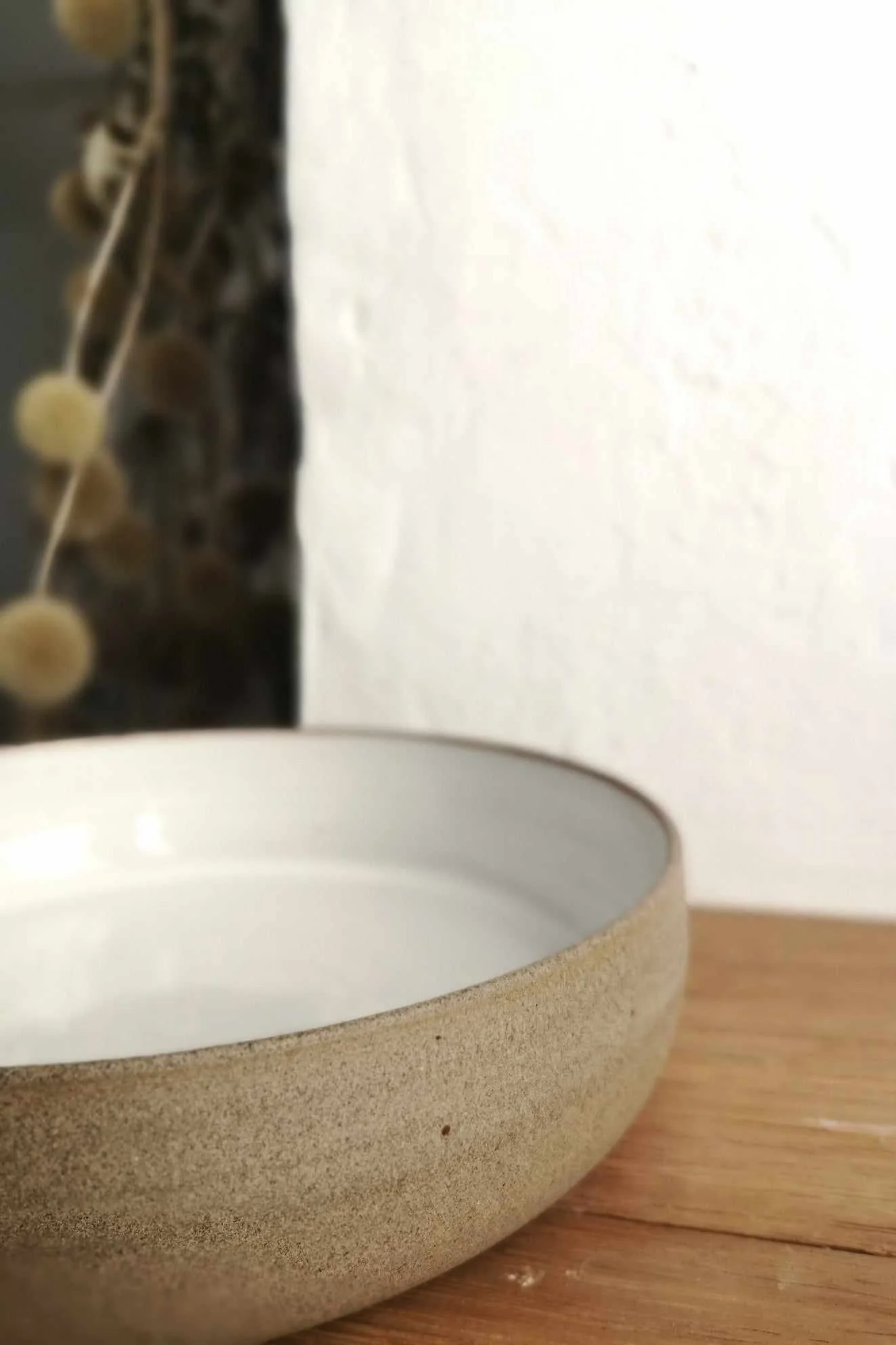 Miska Natural toczona na kole garncarskim z brązowo-piaskowej gliny. Wewnątrz pokryta białym szkliwem, na zewnątrz surowa glina.